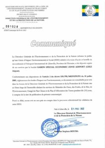 Dans un communiqué, la Direction générale de l’environnement et la protection de la nature informe au public du dépôt, pour consultation pendant 10 jours, d’une étude d’impact environemental et social relative au projet de route d’accès et bretelle de raccordement à l’Aéroport International de Libreville, province de l’Estuaire, par la société GABON SPECIAL ECONOMIC ZONE Airport (GSEZ Airport) dans ses services.