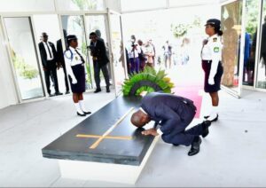 Entouré des Vice-Présidents de la République, des membres du Gouvernement et des proches du défunt, le Chef de l’État a déposé une gerbe de fleurs dans un moment de recueillement solennel.